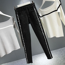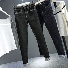 春季韩国黑色小脚裤牛仔裤高腰弹力紧身卷边铅笔裤九分裤牛仔裤女