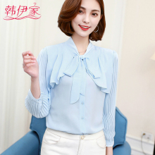 2017春季新款韩版女装修身蝴蝶结系带雪纺衫纯色百搭长袖衬衫上衣