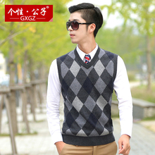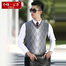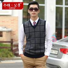个性公子冬季纯羊毛衫马甲加厚休闲V领坎肩男士套头格子羊毛背心