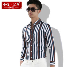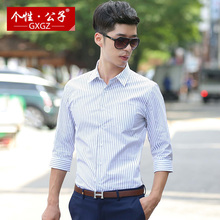 个性·公子春夏季七分袖衬衫男韩版修身竖条纹衬衣小清新寸衣潮流
