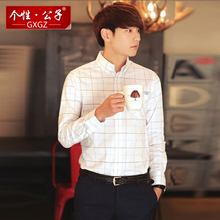 个性·公子2015秋季新韩版修身男士长袖衬衫商务休闲白色格子衬衣