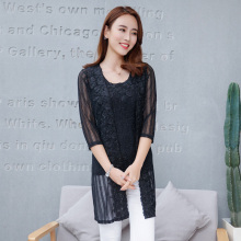 2017夏季新品女装上衣纯色背后牡丹刺绣雪纺衫中长款宽松时尚百搭