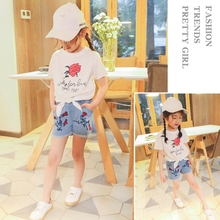 女童短袖t恤套装2017夏季新款中小童薄款玫瑰花t恤牛仔短裤两件套