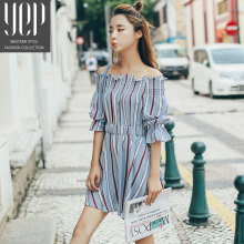 YEP2017夏装女装韩版竖条纹高腰显瘦荷叶边裙子一字领露肩连衣裙