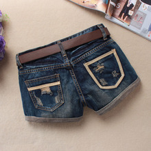 春季新款个性做旧风格深蓝色牛仔短裤女翻边显瘦潮流贴皮包邮