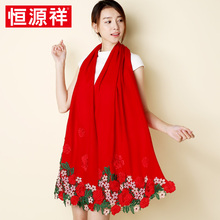 恒源祥女士羊毛围巾披肩田园风贴绣长巾花卉长款保暖纯色绣花韩版
