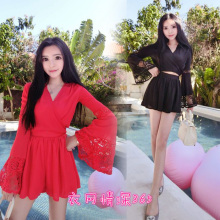 2017夏装新款夜店女装性感V领时尚修身蕾丝拼接雪纺连体裤短裤潮