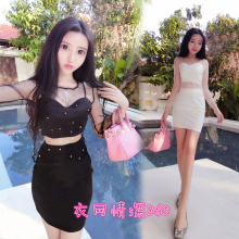 2017夏装新款夜店女装性感网纱透视上衣时尚吊带背心包臀短裙套装