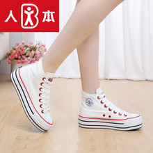 人本高帮帆布鞋女白色学生韩版休闲厚底鞋 系带小白鞋透气松糕鞋