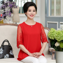 夏季新品中老年妈妈装中袖上衣t恤蕾丝衫中年女装夏装短袖雪纺衫
