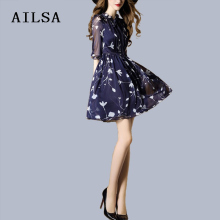 2017春夏款女装优雅中袖印花连衣裙女修身显瘦A字裙雪纺大摆裙 潮