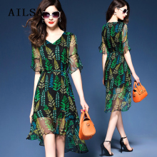 欧洲站2017春夏新款时尚大码七分袖复古印花桑蚕丝连衣裙重磅真丝