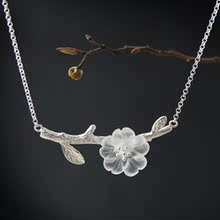 925纯银原创手工雕刻水晶雨中花树枝项链吊坠女款新品情人节礼物