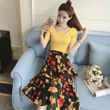 春季新款韩版短袖t恤中长款连衣裙套装女不规则碎花半身裙两件套