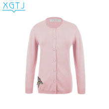 雪国天娇2017新款春季纯色圆领女针织开衫绣花长袖毛衣外套短款