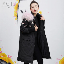 雪国天娇2016新款时尚休闲中国风刺绣大毛领连帽羽绒服女中长款潮