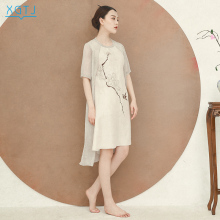 雪国天娇2017夏季新款刺绣时尚中国风假两件短袖纯色中长款连衣裙