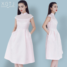 雪国天娇2017夏季新款刺绣时尚中国风茶水服短袖纯色中长款连衣裙