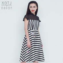 雪国天娇复古中国风中长款2017夏装修身高腰拼接黑白条纹连衣裙女