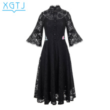 雪国天娇2017春夏新款复古文艺纯色中长款修身立领蕾丝连衣裙女