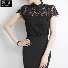 春夏女装100%纯棉黑色镂空蕾丝短袖上衣 修身半高领打底衫女T恤