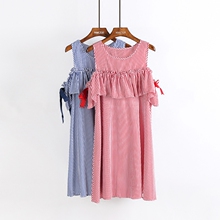 韩版2017夏装新款荷叶边拼接露肩系带竖条纹连衣裙宽松A字裙短裙