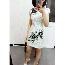 华姿韵正品2017新款旗袍时尚改良日常蕾丝刺绣钉珠短款纯棉连衣裙