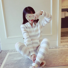 日本软绵绵家居服条纹拉链连帽保暖加厚款秋冬季长袖睡衣套装女士