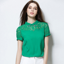 迪图正品2017夏款 简约修身娃娃领蕾丝拼接短袖雪纺衫百搭女上衣
