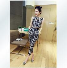 2017春装新款韩版时尚气质格子短款无袖上衣+九分小脚裤套装潮