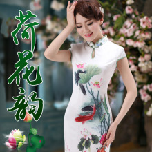 2017新款秋中式改良荷花旗袍长款大码修身显瘦演出礼仪旗袍连衣裙