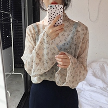 2017春季新款韩版透视性感雪纺衬衣刺绣碎花半高领喇叭袖衬衫女
