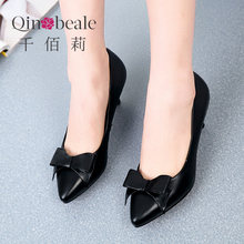 千佰莉 2017春季新款单鞋女中跟 通勤牛皮尖头蝴蝶结细跟浅口女鞋