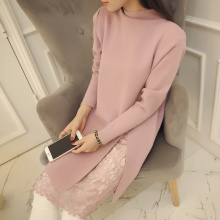韩版秋冬季新款下摆蕾丝开叉加厚毛衣女套头中长款针织打底衫潮F