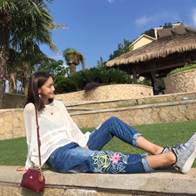 MOMO+/自制款 春季新款刺绣简笔花朵牛仔裤女 宽松BF风哈伦裤长裤