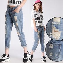 春季破洞九分哈伦牛仔裤女bf风宽松大码胖mm乞丐裤韩版潮显瘦垮裤