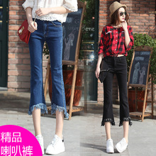 夏季薄款牛仔七分裤女弹力流苏毛边小喇叭裤不规则显瘦微喇7分裤