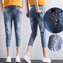 胖mm夏装加大码加肥200斤BF风破洞哈伦七分牛仔裤中裤八分马裤女
