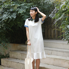原创自制文艺甜美撞色娃娃领织带系带A字宽松显瘦鱼尾连衣裙女