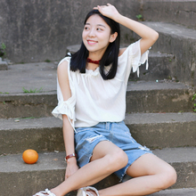 2017夏季新款文艺宽松显瘦系带一字领露肩短袖雪纺衬衫学生打底衫