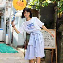 2017新款夏装套装文艺简约宽松字母白T恤+竖条纹绑带松紧半身裙女