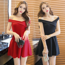 2016夏装新款夜店气质名媛性感交叉一字领露肩收腰大摆连衣裙短裙