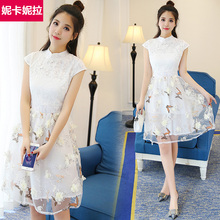 2017新款女装夏装韩版修身高腰连衣裙中裙女蕾丝短袖旗袍欧根纱裙