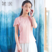裙居2017夏装新款复古苎麻衬衫女麻料女装短袖中式斜襟盘扣上衣女