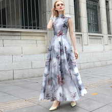 知性长款雪纺连衣裙立领短袖修身印花大摆长裙复古改良旗袍裙女