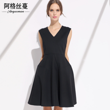 2017夏装女新款欧美修身显瘦中长裙子赫本风小黑裙黑色无袖连衣裙