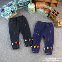 1-3岁 2016新款冬装儿童女小童宝宝韩版彩色毛球针织棉加绒牛仔裤