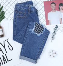 ulzzang宽松bf风显瘦卡通刺绣牛仔裤复古高腰直筒裤哈伦裤九分裤