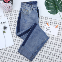 破洞牛仔裤女2017春秋新款韩版bf高腰宽松学生乞丐九分裤哈伦裤子