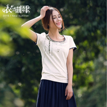 衣之庄园2015夏装新款 修身纯棉V领设计印绣花休闲文艺女短袖T恤